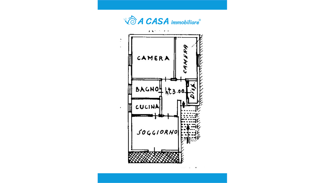 La soluzione è situata al primo ed ultimo piano di una palazzina trifamiliare e si compone di ingresso in disimpegno, tramite il quale si giunge all'ampio e luminoso soggiorno con accesso diretto al godibile balcone. La zona giorno è completata dalla cucina semi abitabile e da un comodo ripostiglio. Mediante il disimpegno si accede alla zona notte dove troviamo una camera matrimoniale, una camera singola ed il bagno con vasca.