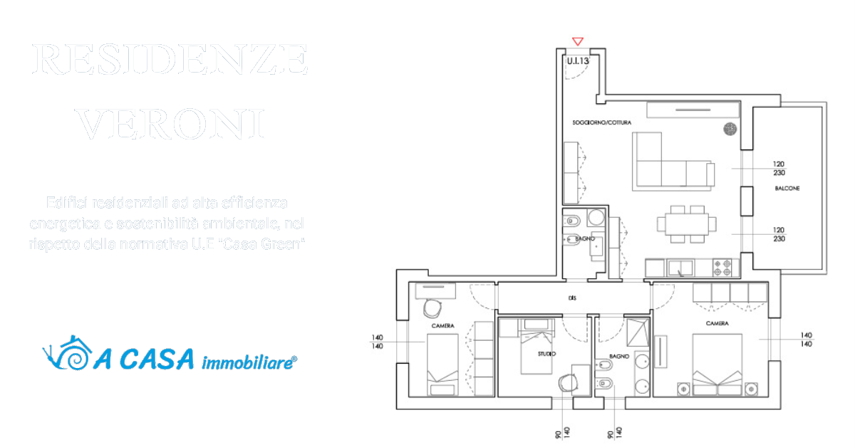 Al piano primo proponiamo in vendita un elegante quadrilocale composto da zona cucina-soggiorno, due camere e uno studio/camera, due bagni e balcone di mq 13, per un totale di mq 115